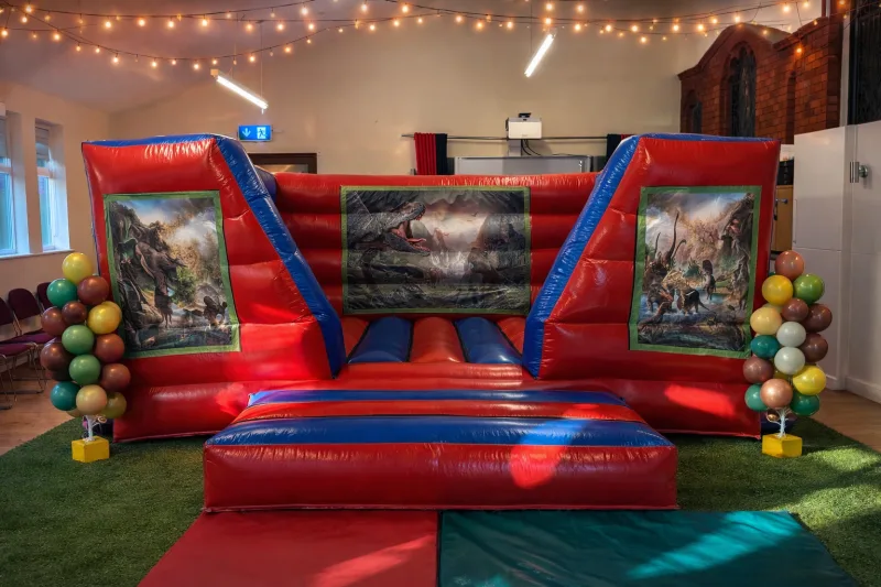 Looking for a DINOSAURS themed bouncy castle hire in Westhoughton, Bolton or Wigan? Our exciting 15ft length x 12ft wide indoor box bouncy castle, standing just 6ft high, is the perfect centrepiece for roar-some birthday parties and prehistoric adventures across the local area.