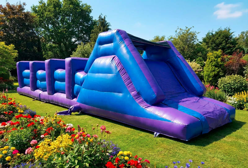 If you're looking for a high-impact inflatable that keeps children active, engaged and entertained for hours, our 14ft x 50ft Purple & Blue Obstacle Course with Slide is the perfect choice.