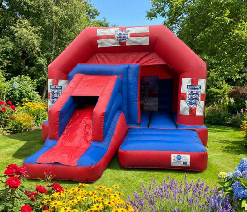Looking for a 17ft x 12ft England combo bouncy castle hire in Westhoughton, Bolton or Wigan? Our bold and patriotic 17ft x 12ft England-themed combo castle in striking red and blue, complete with a built-in front slide and built-in shower cover/sunshade, is the perfect centrepiece for football parties, national celebrations and exciting children's events across the area.